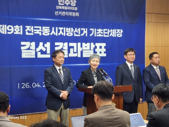 | ↑↑ 더붕어민주당 전북도당 선관위가 4월 22일 오전 11시, 전북도의회 브리핑룸에서 2차 전북지역 기초단체장 결선투표 결과를 발표하고 있다. |