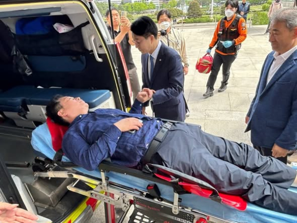국회 앞에서 이원택 의원에 대한 재감찰을 촉구하며 단식 투쟁 중인 안호영 의원이 4월 22일 병원으로 긴급 후송됐다.