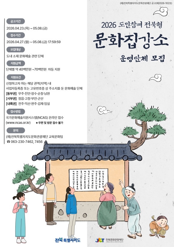 전북특별자치도문화관광재단(대표이사 이경윤, 이하 재단)은 도민이 직접 지역의 문화 의제를 발굴하고 실험하는 ‘2026 도민참여 전북형 문화집강소 프로젝트’ 운영단체를 오는 5월 8일까지 공개 모집한다고 밝혔다.